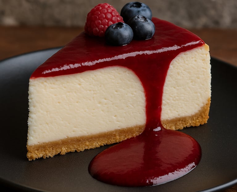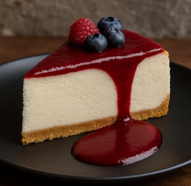 Tarta cremosa de queso al estilo neoyorquino, sobre base crujiente de galleta y coronada con salsa de frutos rojos.