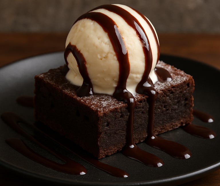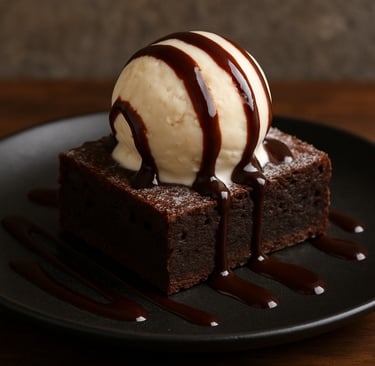 Brownie casero de chocolate negro, caliente por dentro y crujiente por fuera, servido con una bola de helado de vainilla y sirope de chocolate.